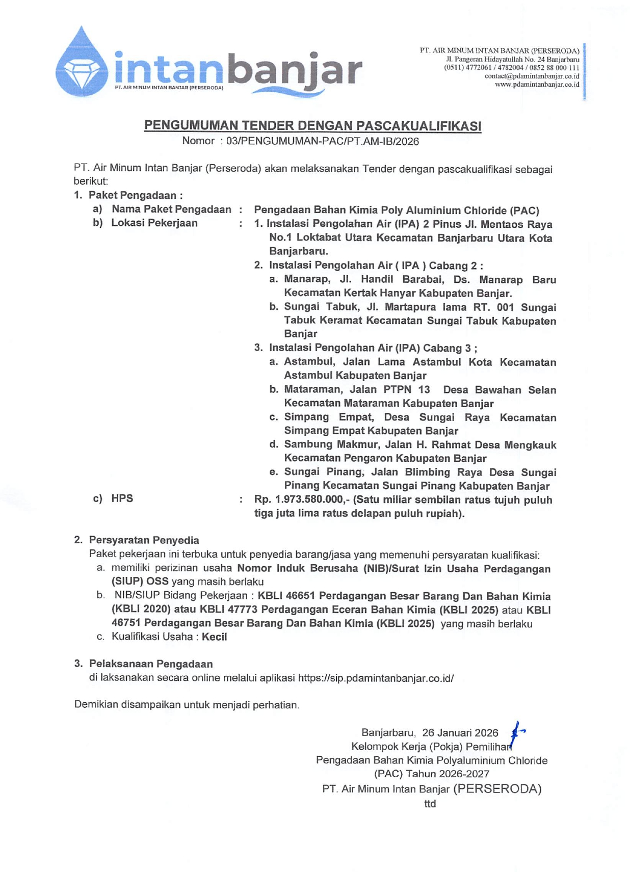 26 Jan 2026 10:12:23 PENGUMUMAN TENDER DENGAN PASCAKUALIFIKASI PENGADAAN BAHAN KIMIA POLY ALUMINIUM CHLORIDE (PAC) 20260126_intanbanjar PT. AIR MINUM INTAN BANJAR (PERSERODAI_page-0001.jpg 695.81 KB Author admin